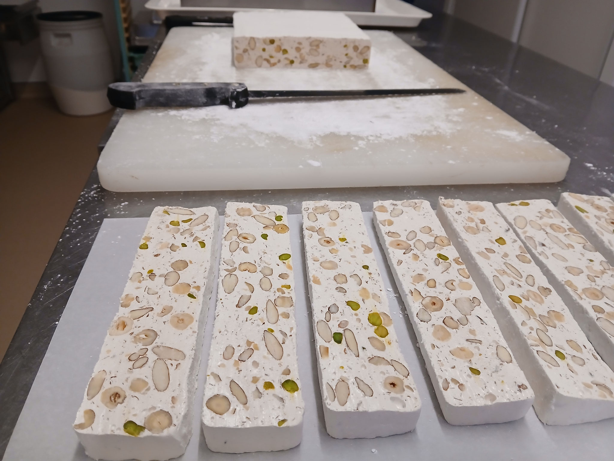 Je propose un nougat tendre de grande qualité avec plus de 20% de miel et plus de 30% de fruits secs. Pour le nougat "classique", j"utilise des noisettes du Lot et Garonne, des amandes du Portugal et des pistaches. Je peux vous proposer aussi des nougats plus originaux : cranberries-chocolat, figues et noix...